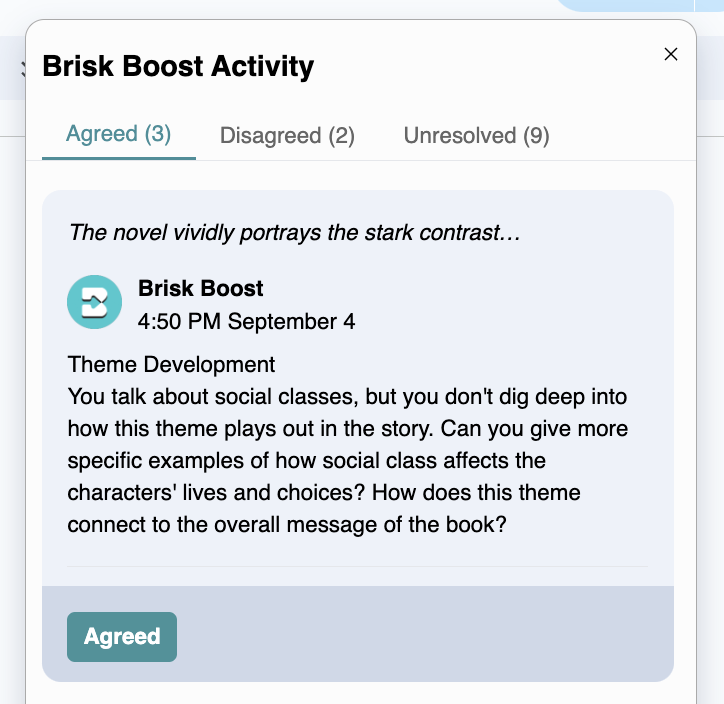 - There you’ll see Brisk Boost’s feedback, and whether your student has responded to that feedback. For comments that your student has responded to, you’ll see whether they agreed or disagreed with the feedback. For feedback that students agree with, the student can share how they responded to the feedback. For feedback that students disagree with, the student can share why they disagree.