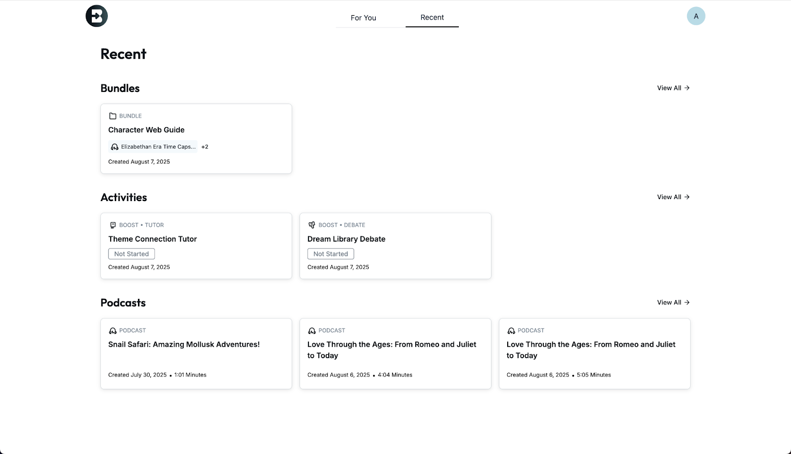 - See all the resources you’ve created in the past, categorized by Bundles, Activities, and Podcasts