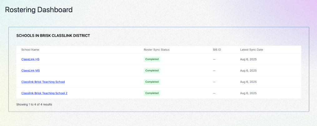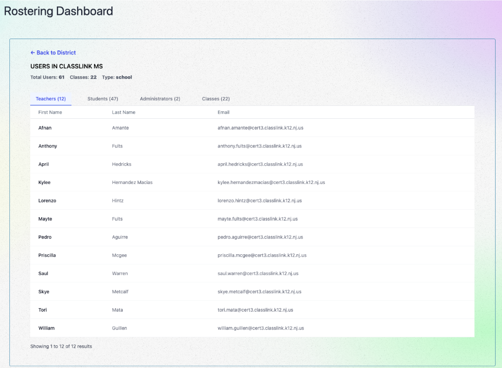 We provide a rostering dashboard to designated rostering admins so you can view the synced data for your district and confirm it matches expectations