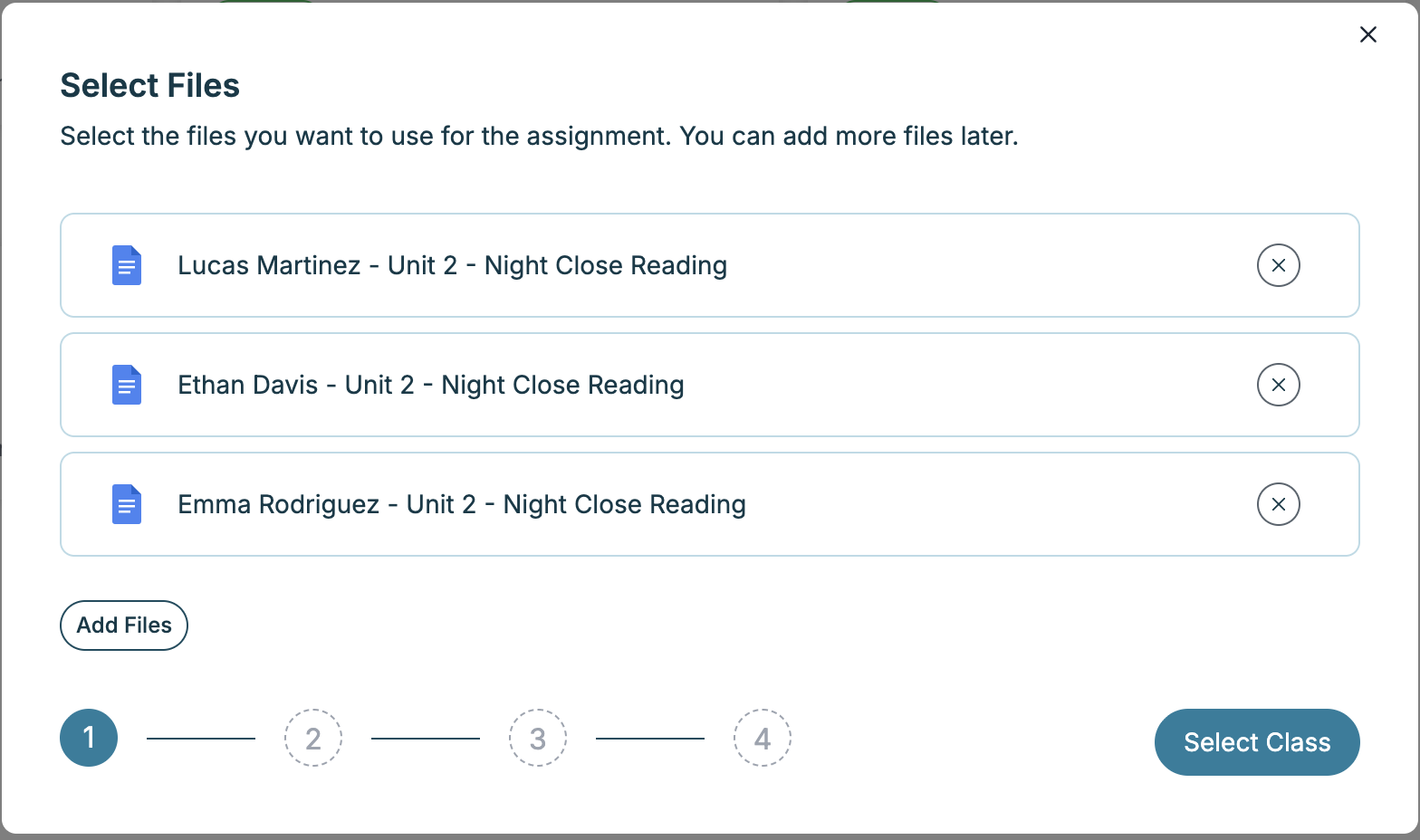 Review the selected essays and remove any you don't want to give feedback on by clicking the X. Then click Select Class.