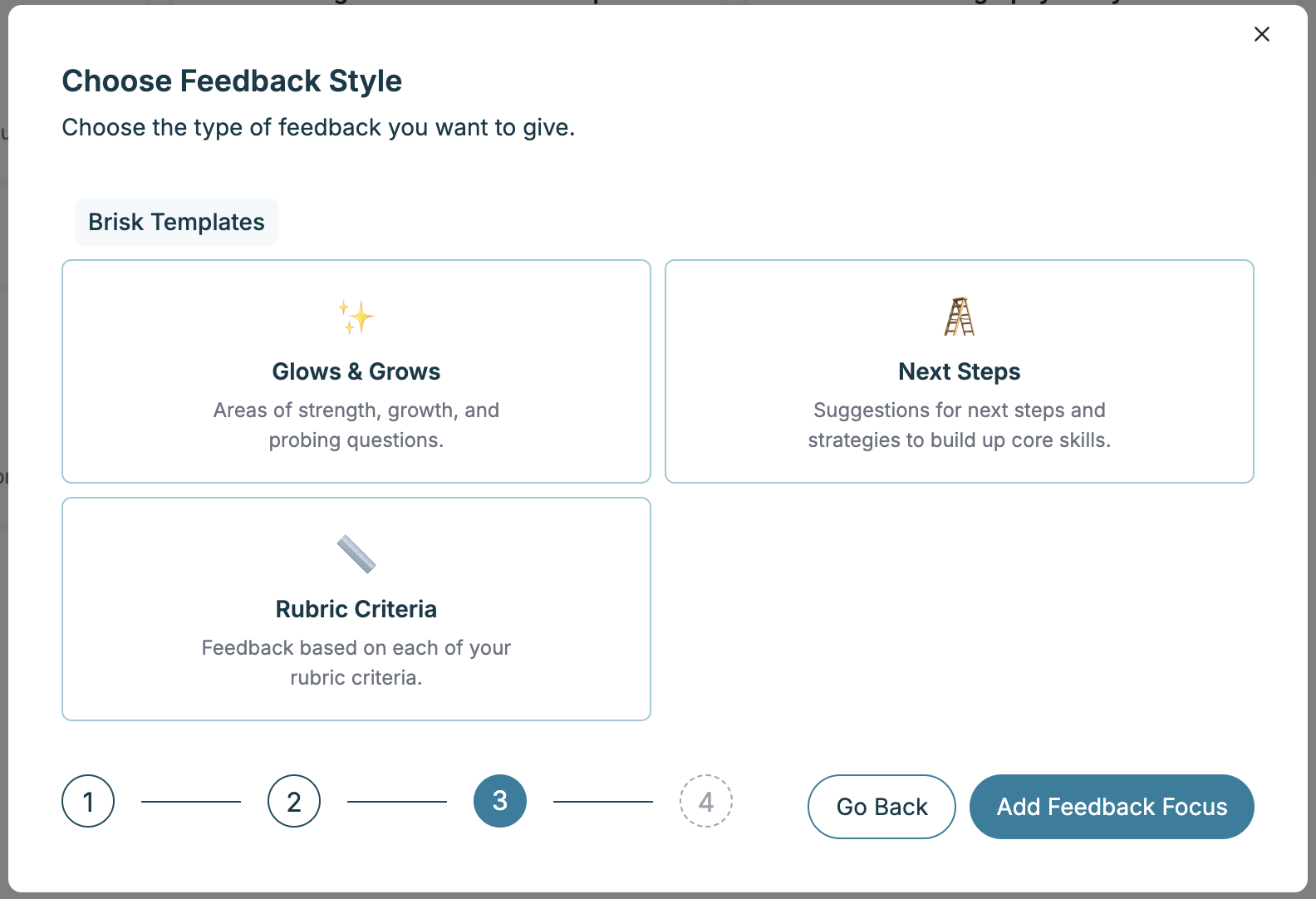 Teachers can choose from 3 main feedback types: Glows & Grows, Next Steps, and Rubric Criteria. Like grading on individual student submissions, teachers will have the choice to add a rubric, select standards and grade levels, and indicate focus areas for feedback.