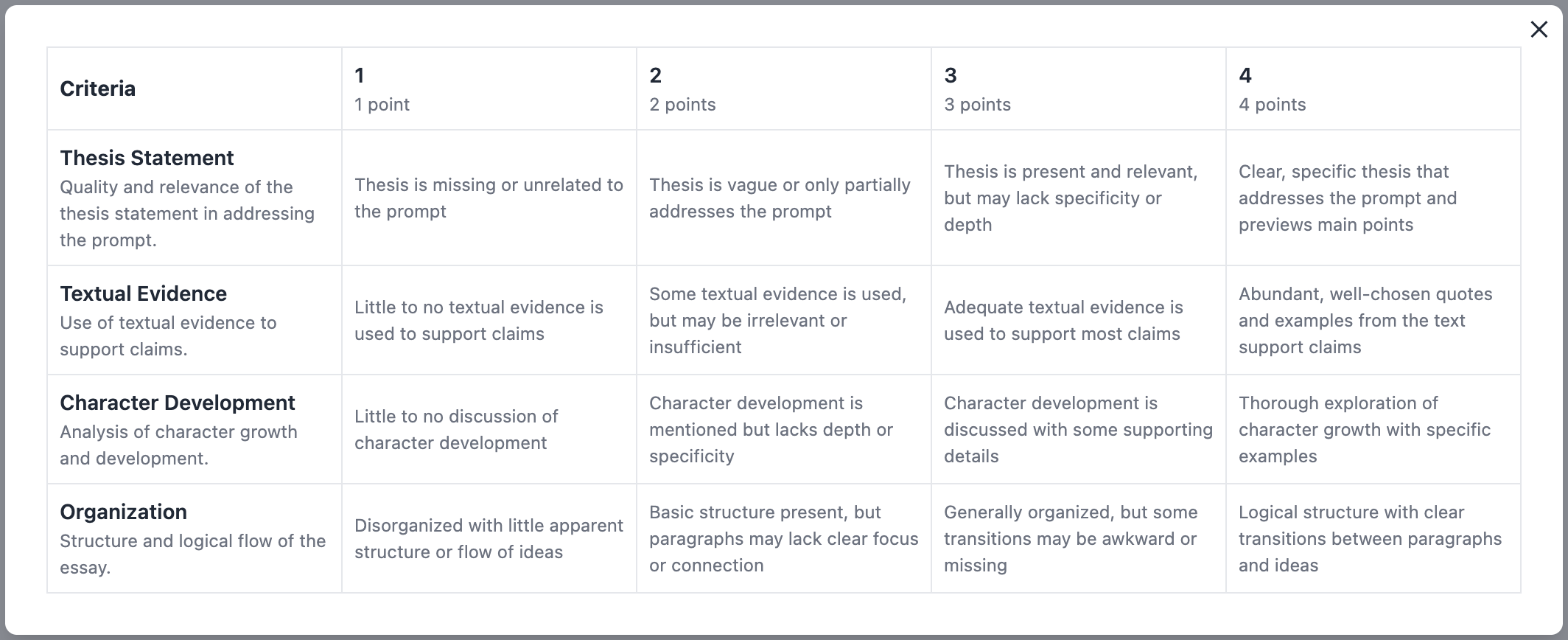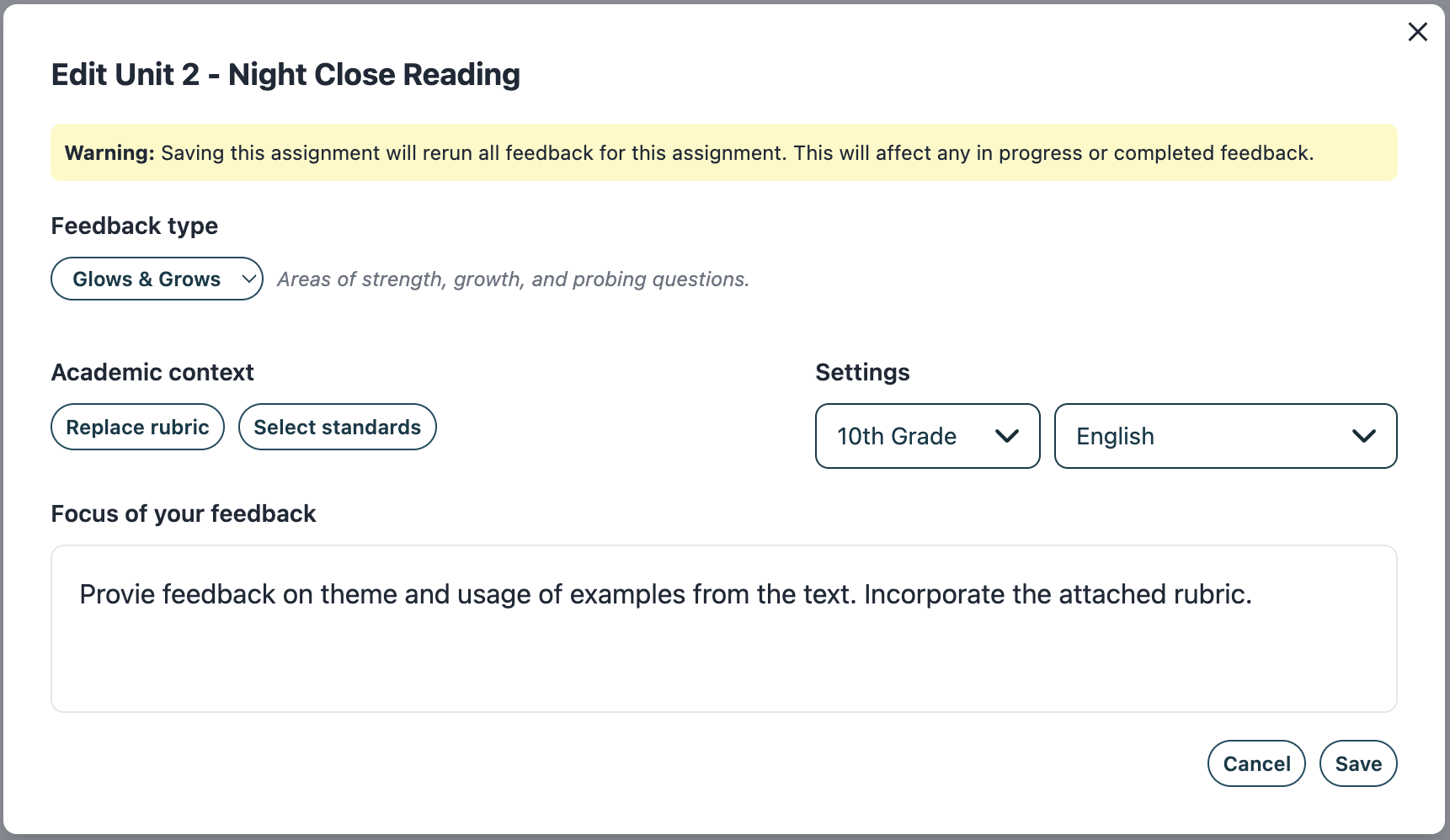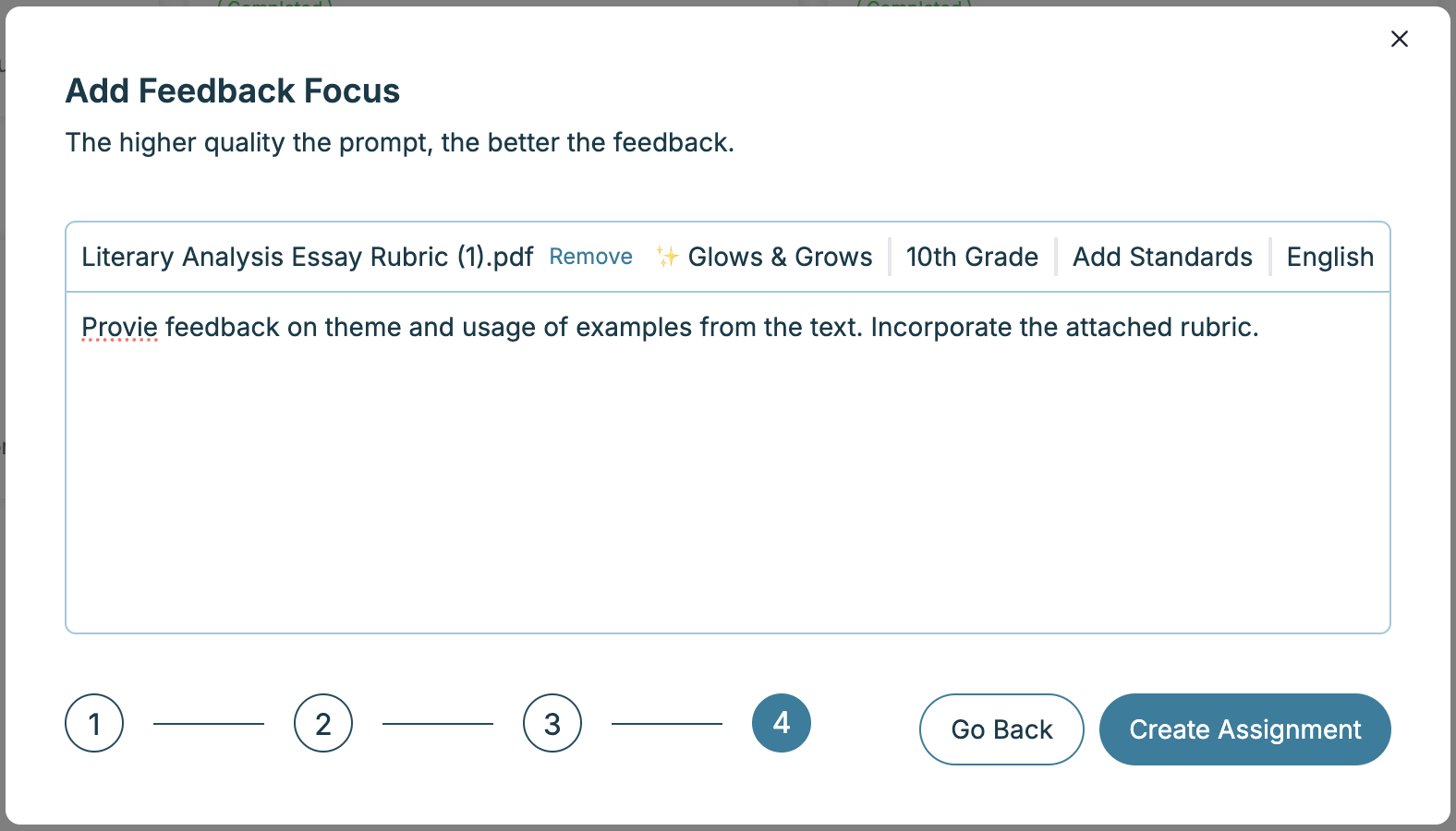 Make selections for grade level, standards (optional), language, rubric upload (optional), and type in what you’d like the feedback to focus on. Then click Create Assignment.