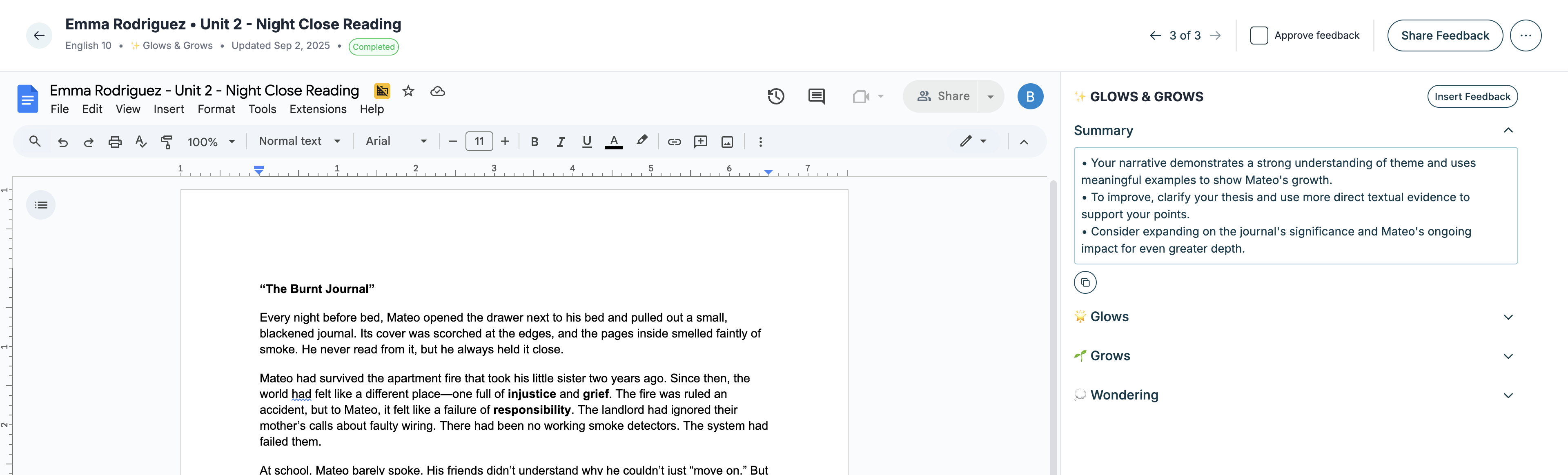 - You can click on an individual assignment to view the feedback for each student, and insert the feedback in their document. This is also where you can choose to approve the feedback using the checkbox at the top, choose to refresh the feedback, or delete the submission. Use the arrows to move between submissions.