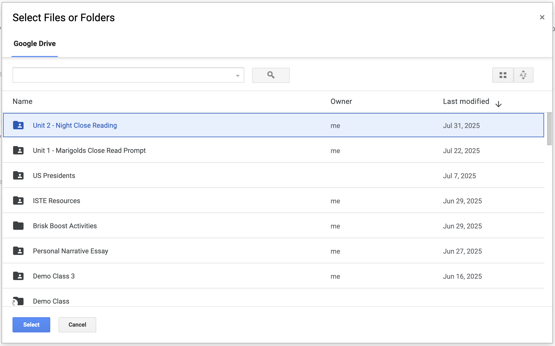 Select the Import Student Work dropdown in the upper right and choose Google Drive or Google Classroom