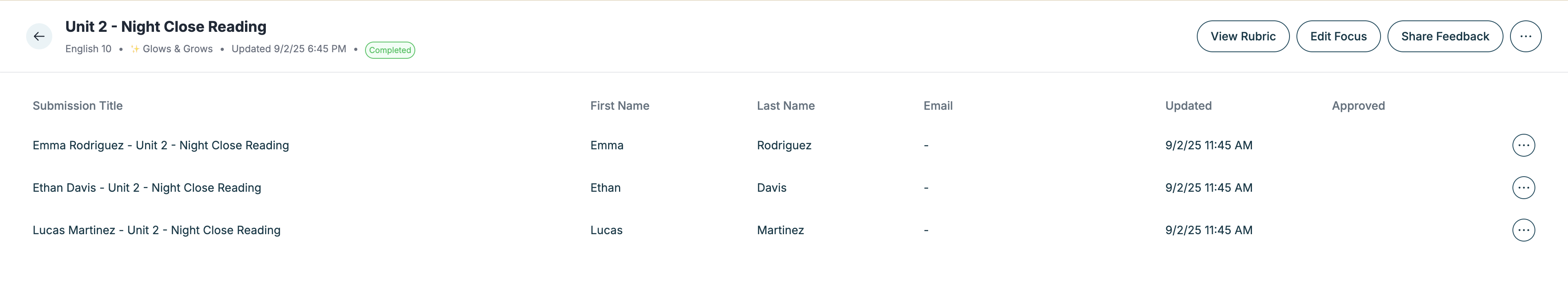 - From this page you can also View Rubric to see the rubric you uploaded, see which submissions you have already approved the feedback for, and Edit Focus of the feedback.