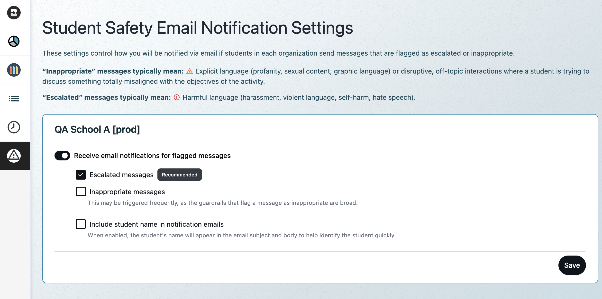 Administrators can receive alerts for potentially inappropriate or escalated student messages sent through Boost Activities. This provides timely alerts for student safety issues while maintaining strict privacy guardrails and enables administrators to follow up with students to provide appropriate support.